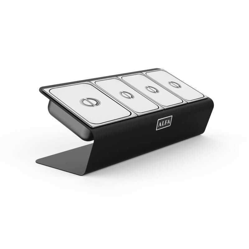 Built from 2mm thick powder-coated carbon steel, the frame offers exceptional strength without sacrificing elegance. The included four stainless steel trays—three GN 1/9 and one GN 1/6—are perfect for sauces, cheeses, herbs, and meats. Snap-on clear lids keep everything sanitary between uses. When it’s time to clean up, just pop the trays in the dishwasher and wipe down the frame with a sponge and mild detergent.