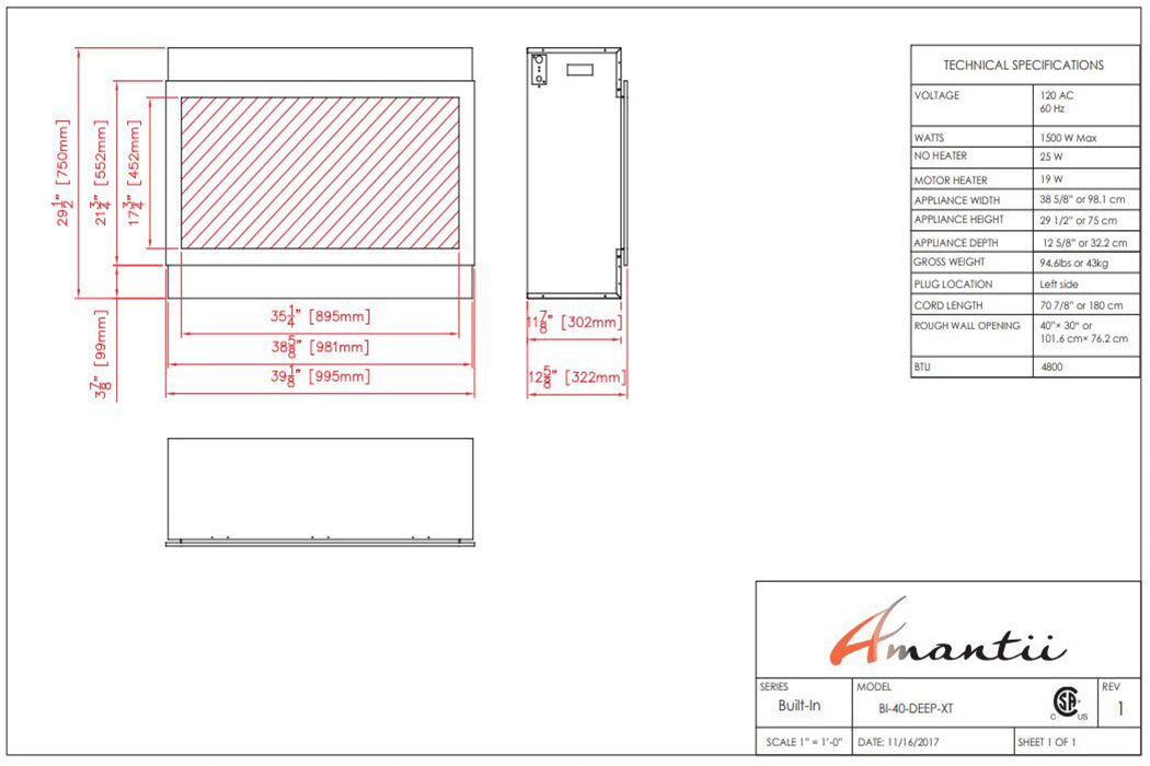 The Amantii Panorama 40-inch Extra Tall & Deep Electric Fireplace boasts a remarkable 12 5/8" depth and a stunning 17 3/4" tall flame viewing area, offering an immersive flame experience that stands out from the rest. This sleek, linear electric fireplace creates a warm, inviting atmosphere both indoors and outdoors, becoming an eye-catching centerpiece in any space. The Panorama Electric Fireplace features a gorgeous, linear full-frame viewing area, which can be installed with your finishing material flush against the glass for a seamless, “clean face” design. Alternatively, you can opt for the included black metal surround. For outdoor installations, an optional Stainless-Steel Cover must be purchased to protect your unit.