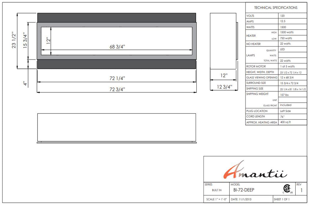 The Amantii Panorama BI-72-DEEP Electric Fireplace offers year-round enjoyment with or without the heater. The included multi-function remote provides effortless control of flame brightness, colors, ambient lighting, and heat settings.