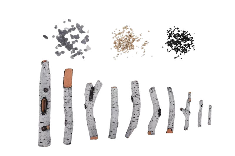 - Realistic 10 Piece Birch Style Log Set, 2 colors of real fireglass, 2 colors of vermiculite