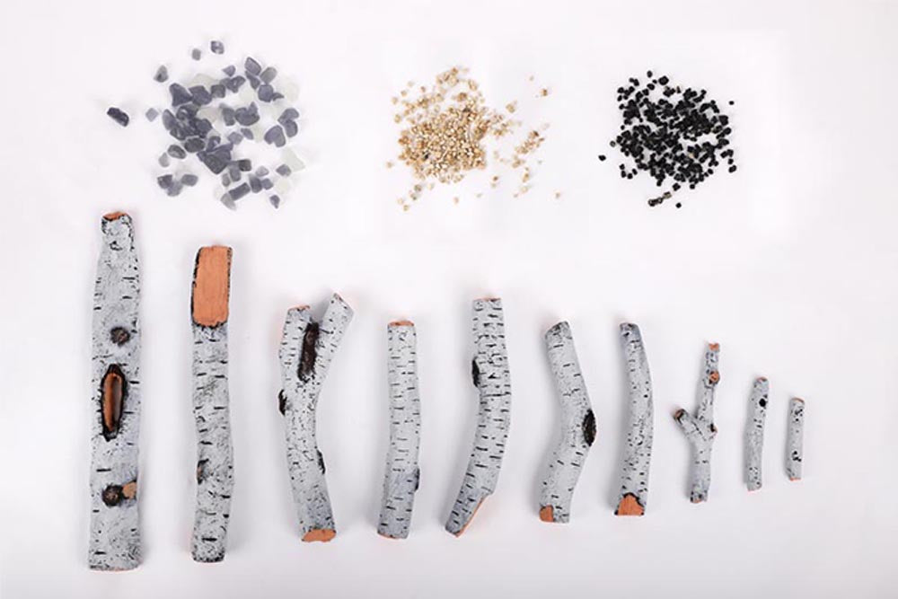 • New birch style log set and glass media included
