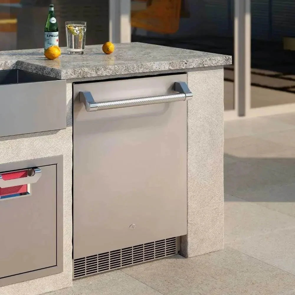 The Aspire by Hestan 24-Inch 5.6 CU. Ft. Reversible Hinge Outdoor Rated Refrigerator with Lock - ERS24 offers convenient cold storage for your outdoor cooking area. Crafted with a combination of sleek aesthetics and durable construction, this undercounter refrigerator is designed to seamlessly integrate into your outdoor space.