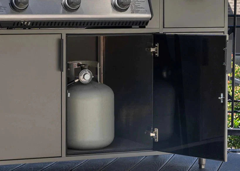 With plenty of storage and a 28 Inch Built-In Griddle this standalone Griddle Island Challenger Bundle will completely transform your outdoor kitchen. Featuring two soft close drawers, a pull-out trash bin, two cabinets, and Natural Gas storage. The cabinets and drawers are weather-sealed to protect the contents from the elements. This unit has marine-grade aluminum construction with a heavy duty powder coating, making it perfect for your patio. With leveling feet to ensure stability and solid filled cabinet doors, this will be the pinnacle of your patio.