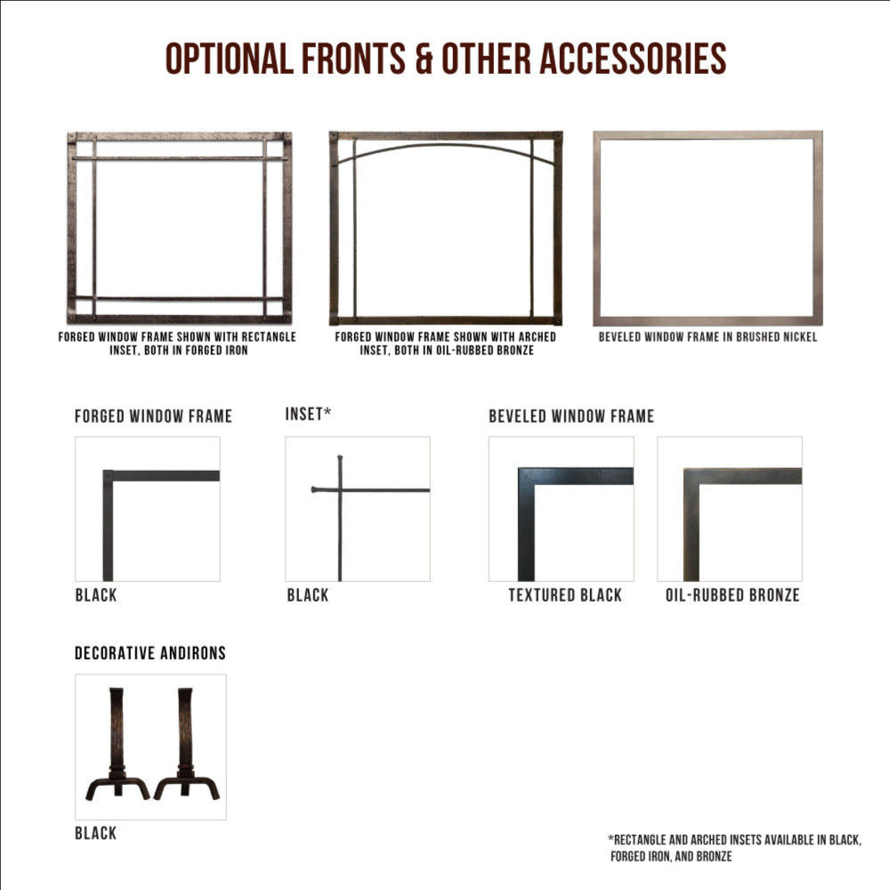 • Customizable options for fireplace liner, log set and decorative doors allow for a personalized appearance.