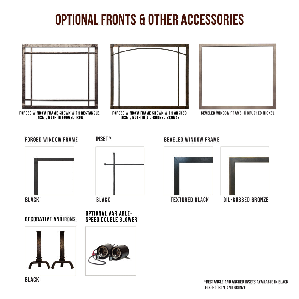 • Customizable fireplace liner and decorative door options allow for a personalized appearance.