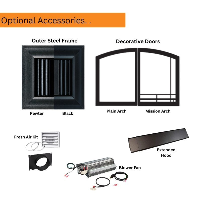 3. Decorative Doors - Add a decorative barrier to your firebox with the plain arch or mission arch decorative doors. Each door comes with handles, screen, hinges and outer decorative frame.