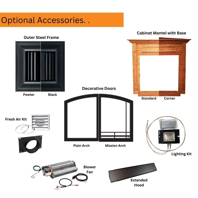 3. Decorative Doors - Add a decorative barrier to your firebox with the plain arch or mission arch decorative doors. Each door comes with handles, screen, hinges and outer decorative frame.