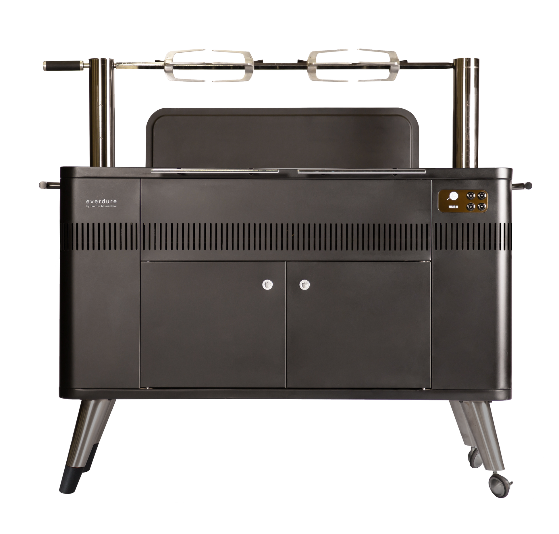 The Everdure HUB II outdoor grill is a great combination of modern features and classic grilling techniques. Its Fast Flame Ignition system ignites the charcoal at the perfect temperature in 10 minutes with the press of a button. The built-in rotisserie, powered by patented Rotiscope Technology, has 3 height settings and supports up to 85 lbs of meat, with Cliplock Forks to hold everything in place. The HUB II is easy to clean and maintain with porcelain enamel firebox and charcoal tray. The charcoal grill also has a retractable power cord, 2 chrome grills, and a two-shelf storage/warming area behind double-lined doors. The titanium finishing adds to the grill's sleek design. The Everdure By Heston Blumenthal HUB II 54-Inch Charcoal Grill With Rotisserie & Electronic Ignition will add style and cooking excellence to elevate your outdoor lifestyle. Command your backyard while entertaining your family and friends with a fresh cooked meal.