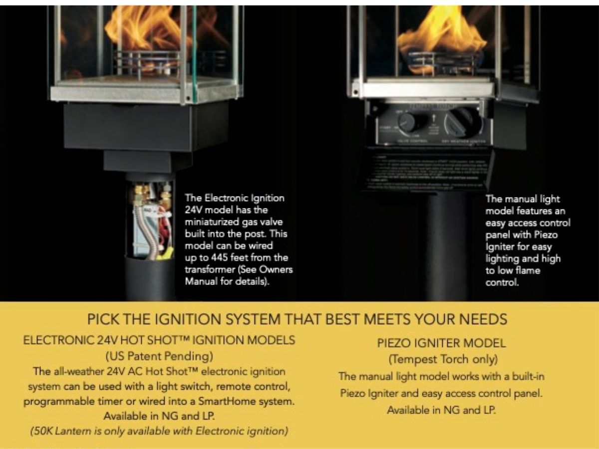 Constructed with four sides of heat-tempered glass, the Tempest Torch has been rigorously tested to withstand extreme heat, freezing temperatures, and year-round outdoor conditions. Its 24V AC Hot Shot electronic ignition system is among the most reliable in the industry and includes an automatic gas shut-off for added safety should the flame ever go out.