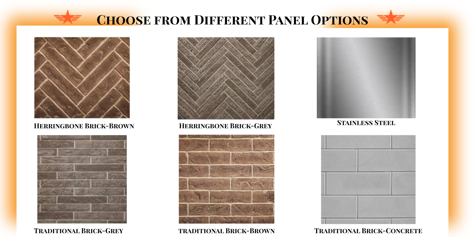 Multiple interior options to choose from including: stainless steel, traditional brick, and herringbone brick.
