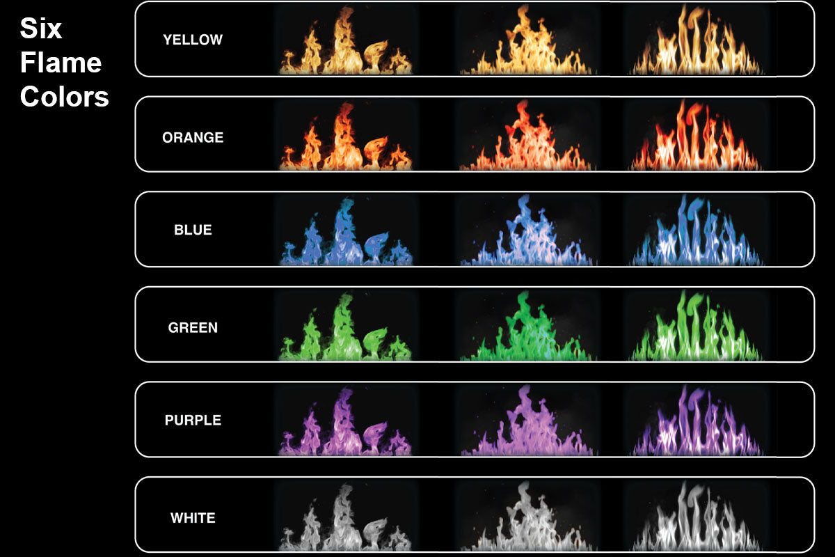 • 6 Flame colors: yellow, blue, green, orange, purple, white