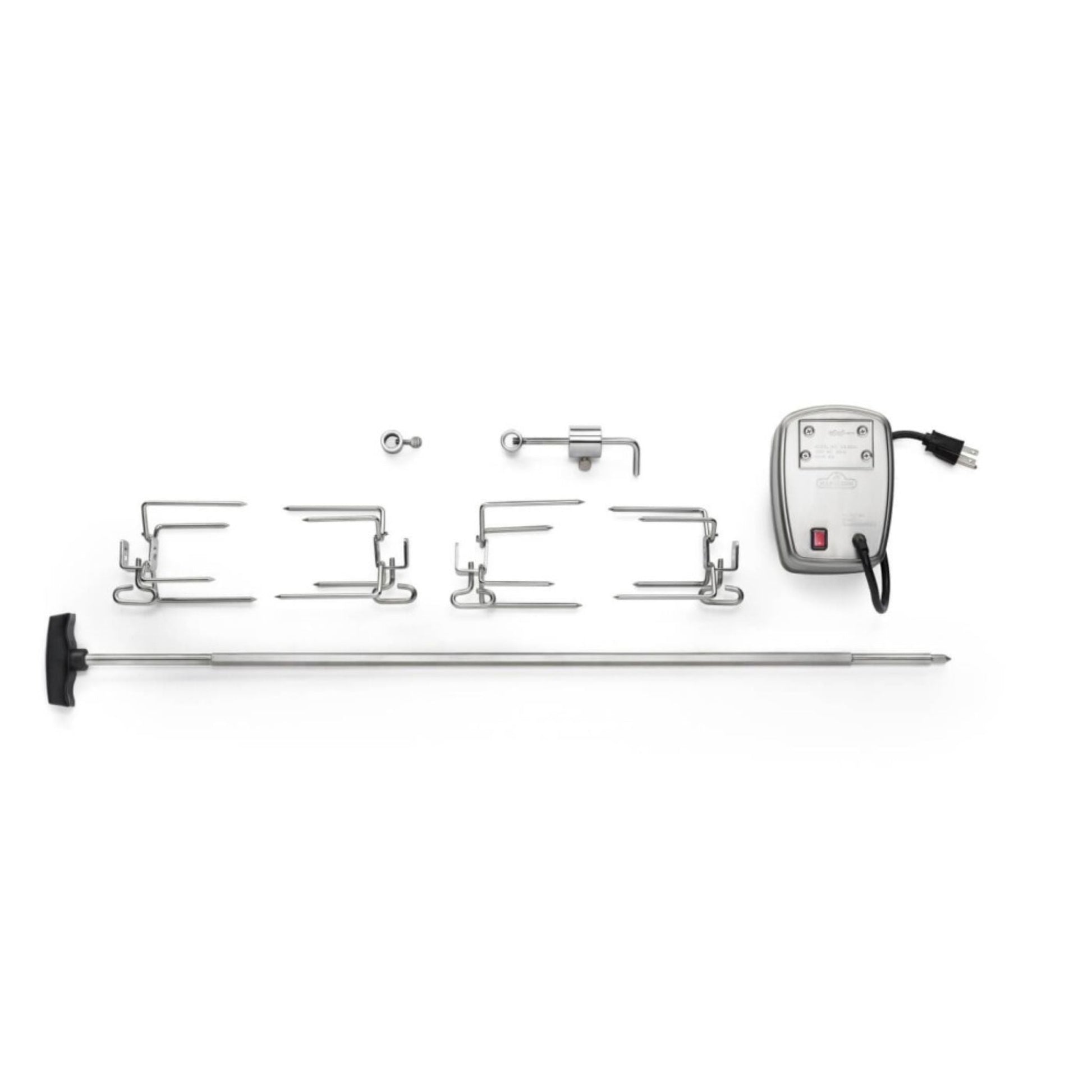 • Kit contains: 1 commercial grade rotisserie motor, 1 XL food grade, stainless steel, hexagonal rotisserie spit rod, 4 large, stainless steel rotisserie forks, 1 stainless steel counter balance assembly, 1 stainless steel stop bushing, 1 T-handle