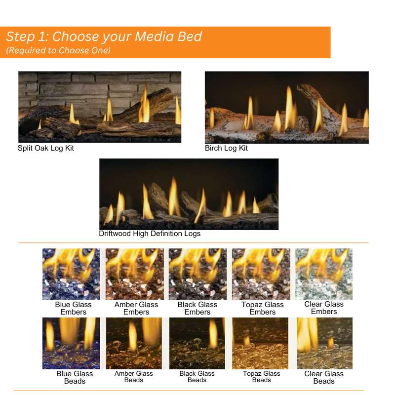 Step 1 Choose your Media Bed for Napoleon Ascent Premium Series Linear Direct Vent Gas Fireplace Birch Log Kit, Split Oak Log Kit, Driftwood High Definition Logs, Glass Embers & Glass Beads