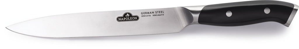 Napoleon's Carving Knife is a beautiful addition to your knife block. The forged stainless steel runs the full length of the knife; It is balanced from the tip, all the way through the tang. The dual riveted handle provides ergonomic comfort. This knife's blade is much thinner than an all-purpose chef's knife allowing for thinner and precise slicing of roasts, hams, and other large cooked meats. So, whether you are a gourmet grill master or a fanatical foodie, this Chef's Knife is perfect for your culinary arsenal.