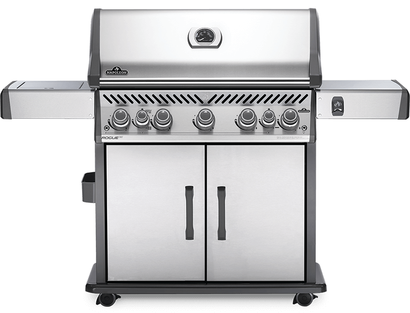 Elevate your grilling experience with the Napoleon Rogue® SE 625 Stainless Steel  Napoleon Gas Grill. Crafted from durable stainless steel, it boasts five main burners, a rear rotisserie burner, and a high-top lid. Achieve restaurant-quality searing with the integrated sear station and enjoy ample prep space on generous side shelves. Take your grilling to the next level!