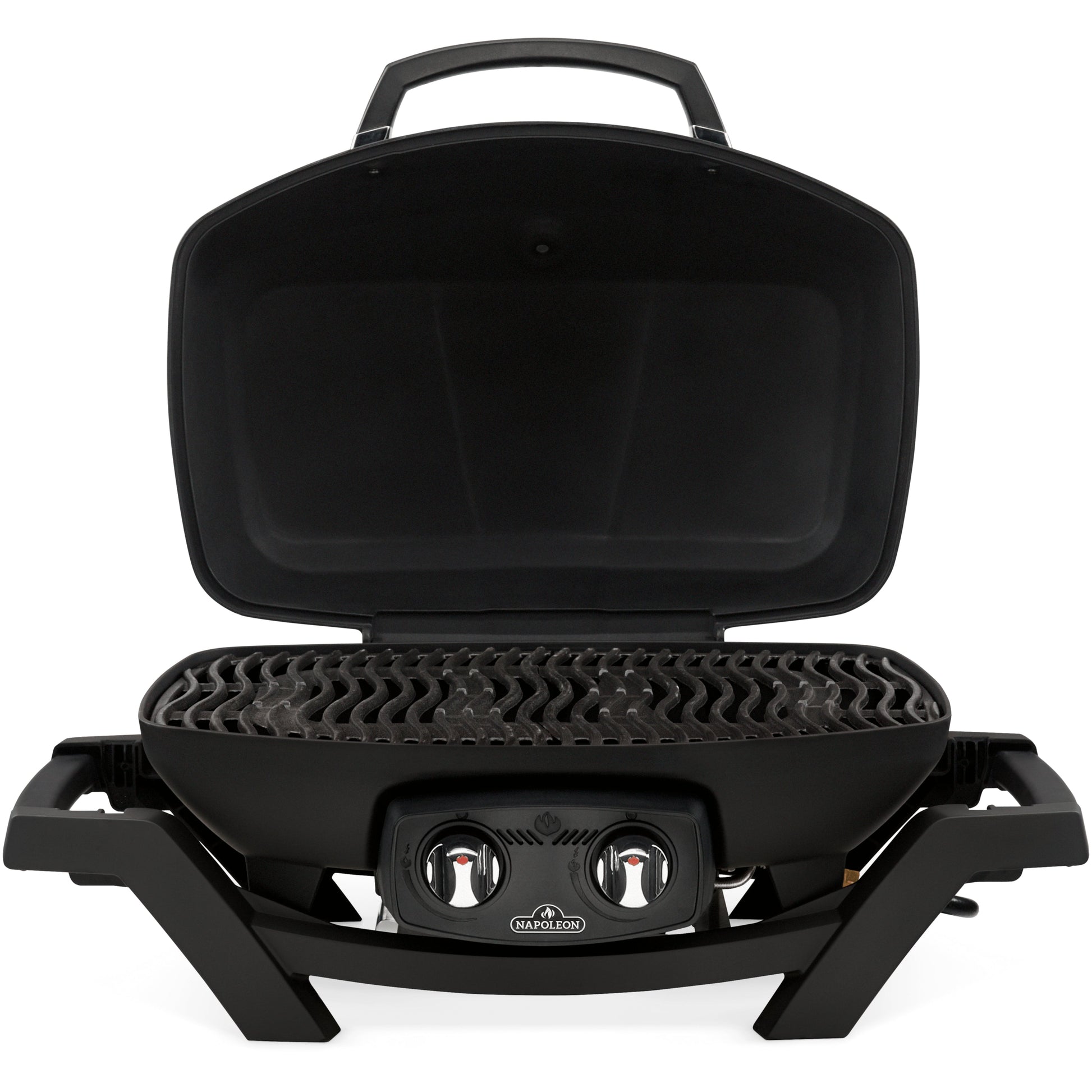 Napoleon's TravelQ™ PRO 285 Portable Natural Gas Grill packs a punch. Grill up to 18 hamburgers at once on the 285 square inches of cooking area. No setup or prep required, just add natural gas. The stylish all-black finish with chrome details will complement your outdoor decor. The cast aluminum, high-topped lid design lets you take portable grilling to the gourmet level. Roast whole chickens or turkeys, pork and even prime rib. Using the dual stainless steel burners, you have precise control over the temperature, just like on Napoleon's full sized grills. Get the TravelQ™ PRO 285 up to high temperatures for the perfect sear; you'll know it's a Napoleon with the iconic WAVE™ cooking grids for those distinctive sear marks. Like your favorite cast iron skillet, the porcelainized cast iron cooking grids heat evenly and provide a non-stick surface for your food, seasoning like a cast iron skillet. You can't beat this portable, professional package.