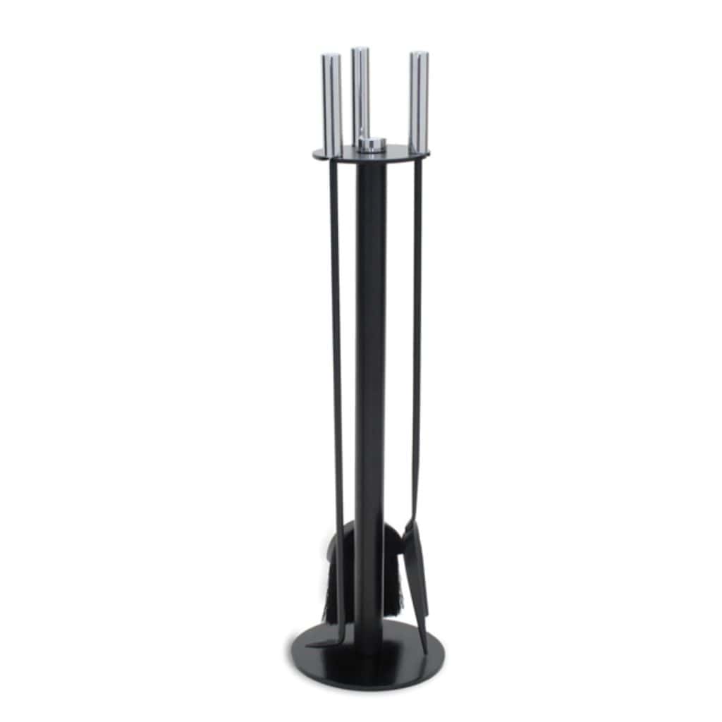 • The clean lines of the sleek black stand support a poker, natural Tampico fiber brush, and shovel