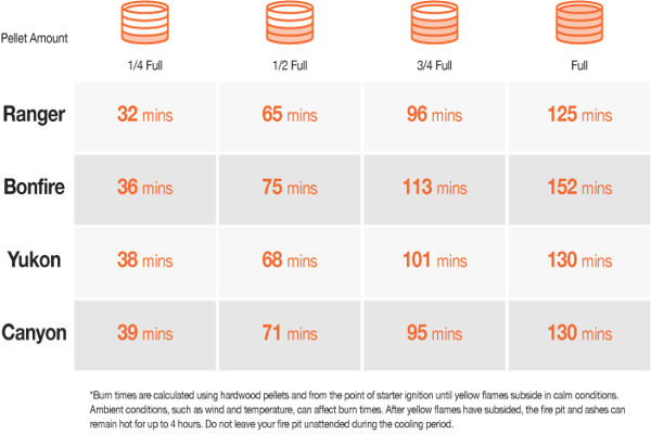 Will pellets always burn for 2+ hours? The duration of your fire will depend on the amount of pellets you put into your fire pit. If you fill your pit to the top (about 1” below the secondary burn holes), you will have flames for 2+ hours. If you want to have a shorter fire, simply add fewer pellets. ½ the number of pellets will burn for approximately half the time.