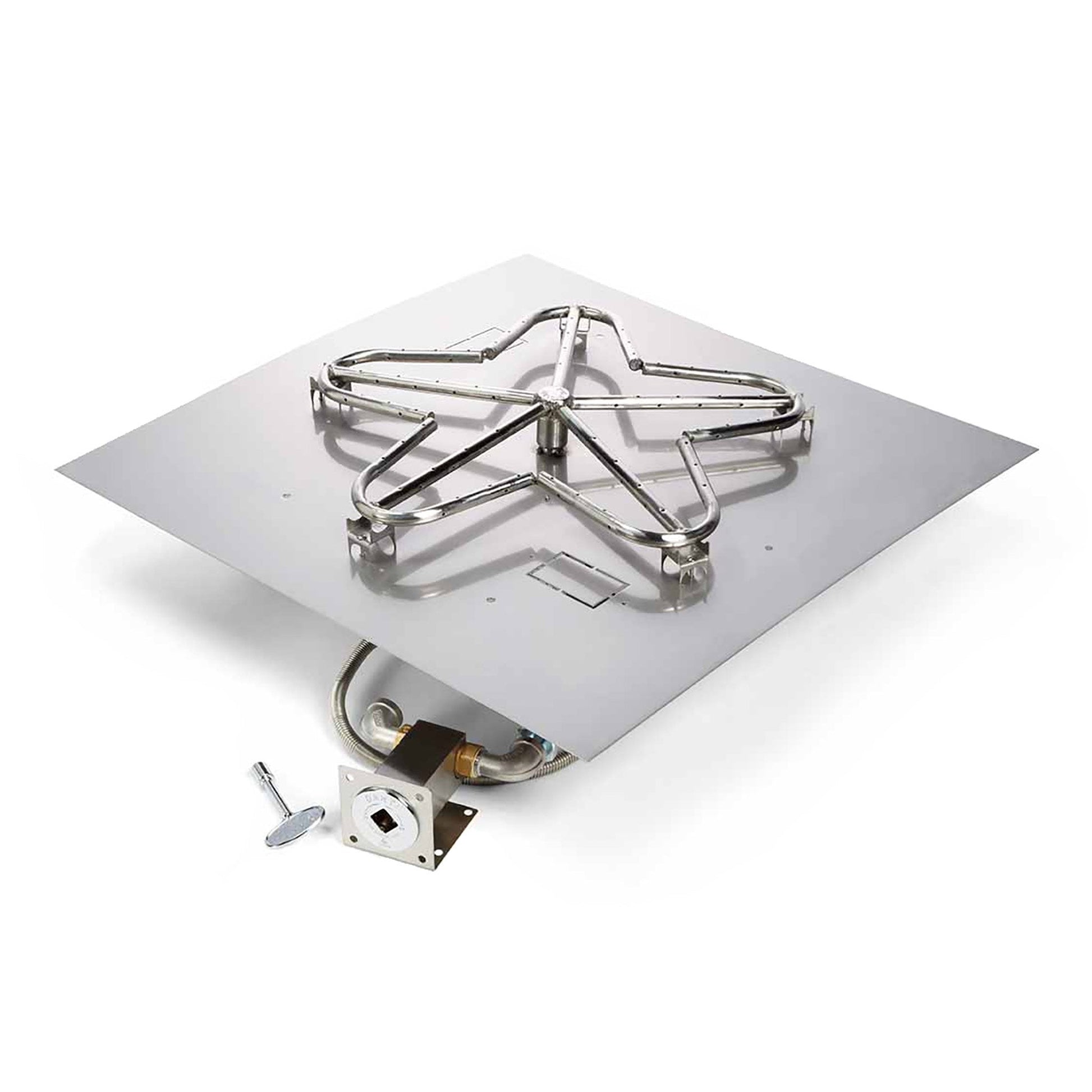 The included penta burner fits seamlessly within the edges of the square fire pit pan. Both components are constructed from durable 304 stainless steel, offering superior resistance to rust, corrosion, and outdoor elements. The burner’s raised center hub prevents water from entering the gas line, protecting your system from potential damage and noise issues.
