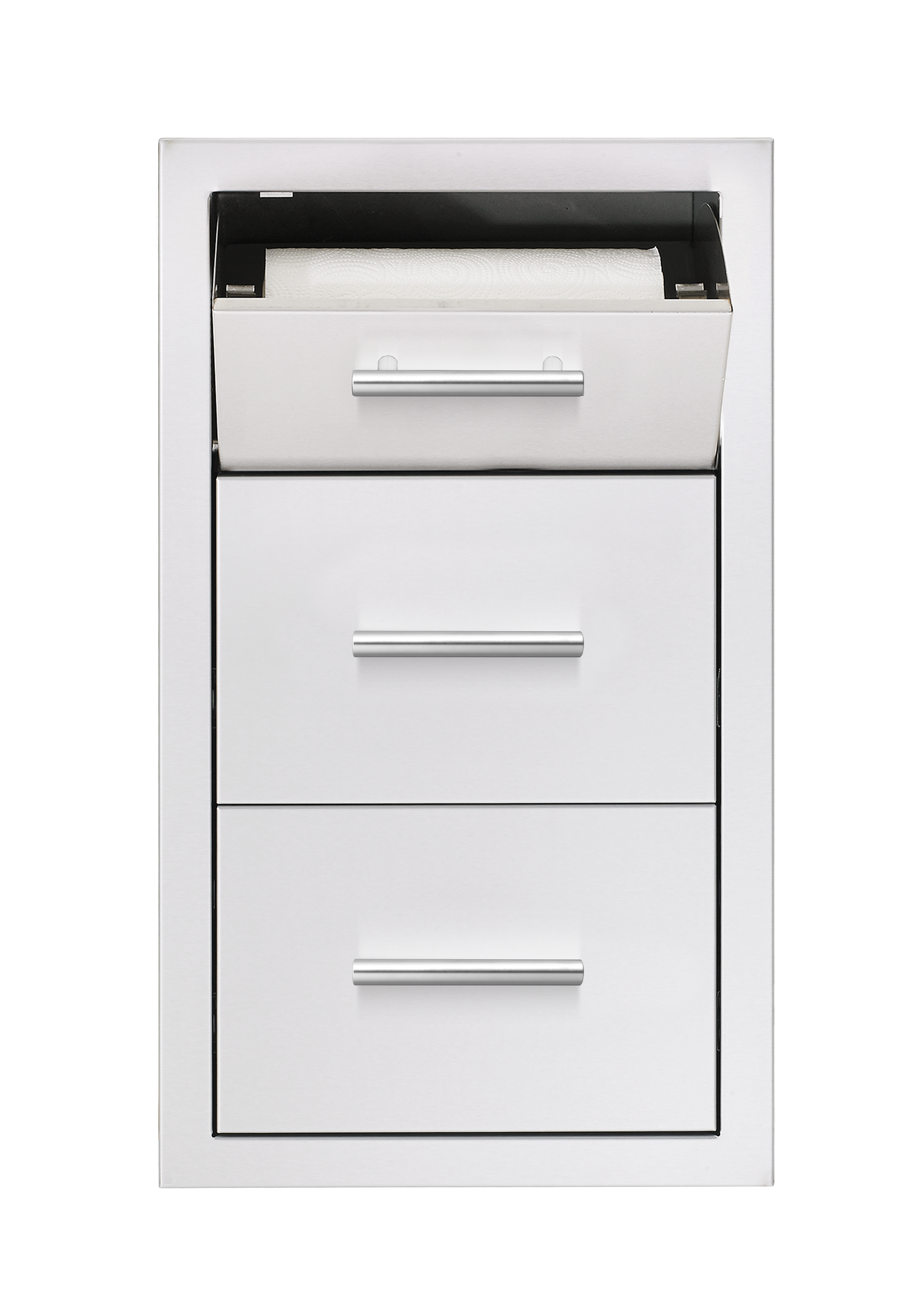 Soft Closing Heavy-Duty Pivot Hinge Paper Towel Drawer to keep paper towels dry and effortless to open for convenience and functionality in your outdoor kitchen.