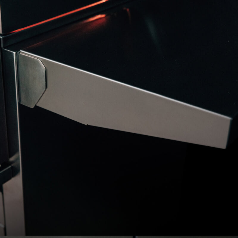 This cart also includes double door storage, providing ample room for your grilling tools and accessories. The soft-close door hinges allow for smooth and quiet access, adding a touch of luxury to your grilling experience. The propane tank storage is designed for safety and convenience, securely holding the gas tank in place while moving the grill. This ensures a safe and efficient transportation process. The collapsible stainless steel side shelves save space when not in use, helping you maintain a tidy outdoor cooking area. Magnetic access door latches guarantee a secure close, whether the cart is stationary or in motion. Additional features like an interior paper towel holder make cleaning up while grilling or entertaining a breeze. Ventilation on the side, rear, and bottom ensures proper air circulation, preventing gas buildup and maintaining heat safety.