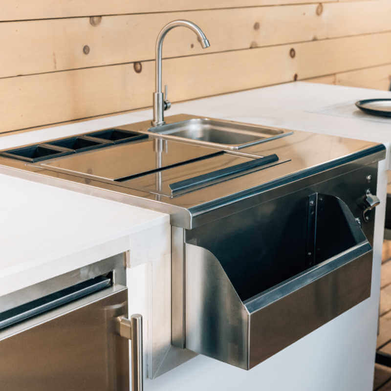 • A stainless steel sink with a cold water faucet provides more functionality for cleaning and prepping in your outdoor entertaining space.