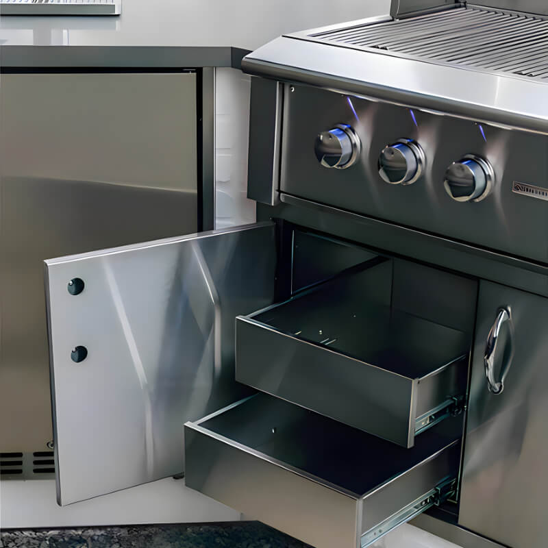 Elevate your outdoor kitchen with the TrueFlame 36-Inch Two Drawer Dry Storage and Access Door Combo—a smart, all-in-one solution designed to keep your essentials organized, moisture-free, and within reach. Built from commercial-grade 304 stainless steel, this ultra-durable unit is engineered to withstand the harshest elements while maintaining a sleek, modern appearance that complements the full suite of TrueFlame appliances. With a 100% moisture-proof design, this cabinet protects spices, utensils, dinnerware, and other dry goods from humidity, pests, and weather, eliminating the need to shuttle items indoors after every cookout. Heavy-duty weather seals and powerful magnetic latches ensure the doors close securely, while the hinge-less design offers a clean, streamlined look. Inside, two full-extension drawers with soft-close, ball-bearing glides offer generous, easily accessible storage space. The adjacent access door provides safe, convenient entry to electrical connections and gas lines, adding an extra layer of utility to your setup. Whether you're prepping a meal or shutting off your grill’s fuel supply, this versatile combo enhances both function and safety. The TrueFlame 36-Inch Dry Storage Combo isn’t just a storage unit—it’s a weatherproof, high-performance upgrade built to keep your outdoor kitchen clean, organized, and running smoothly.
