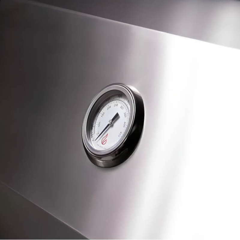 A multi-position hood hinge allows for controlled lid access without losing heat, while dual halogen lights and a large analog thermometer keep your cooking precise, day or night.