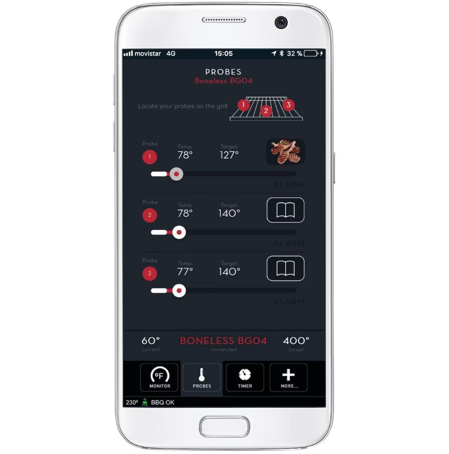 • Temperature Probes: Three probes monitor food and provide updates on the control panel or app.
