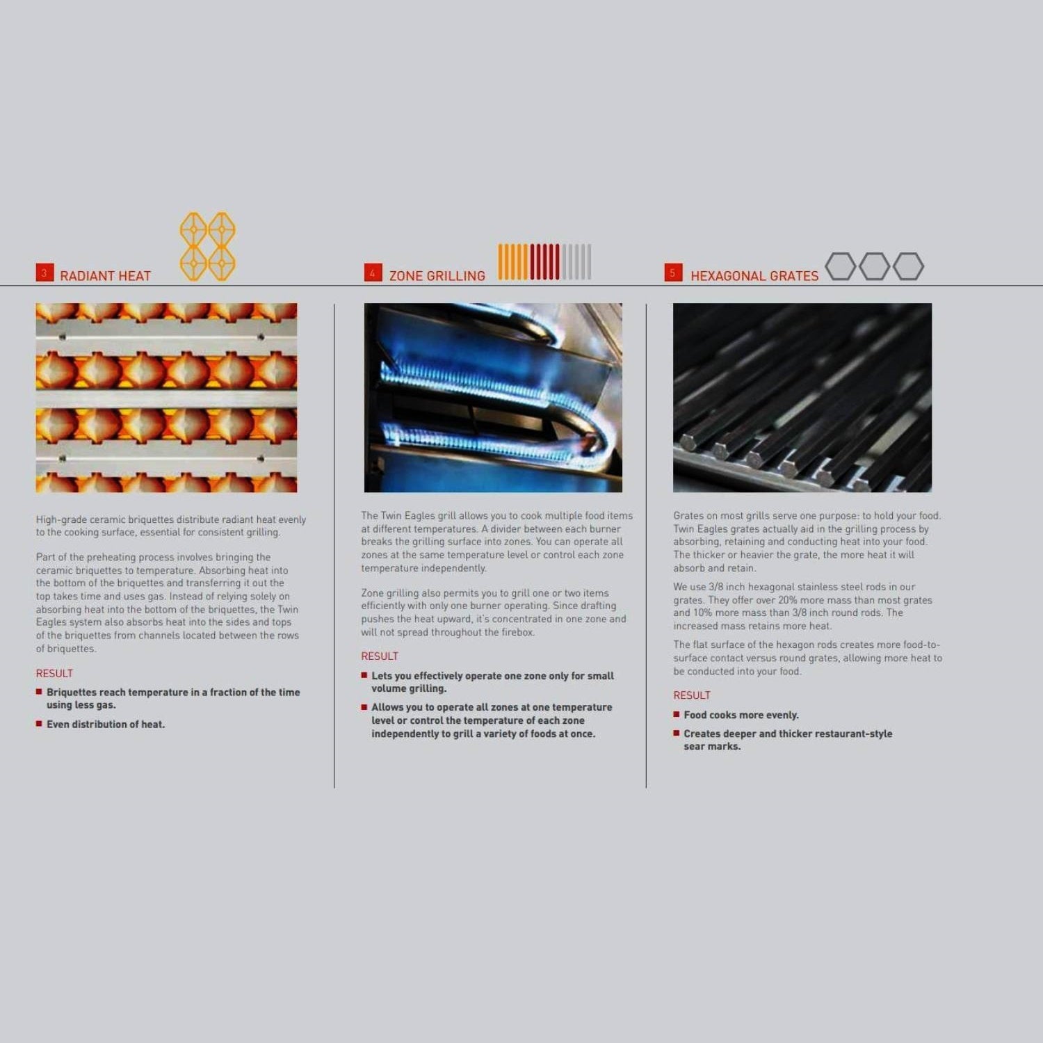 Each Twin Eagles grill combines direct heat from specifically placed ports and channels with radiant heat from the ceramic briquette grates, allowing your grill to reach higher temperatures and distribute heat evenly--ridding your grill of hot and cold spots. Also unique to Twin Eagles are their 3/8-inch stainless steel hexagonal grates. These heavy-duty grates allow more heat retention and surface area, resulting in deep, dark, restaurant-style sear marks.