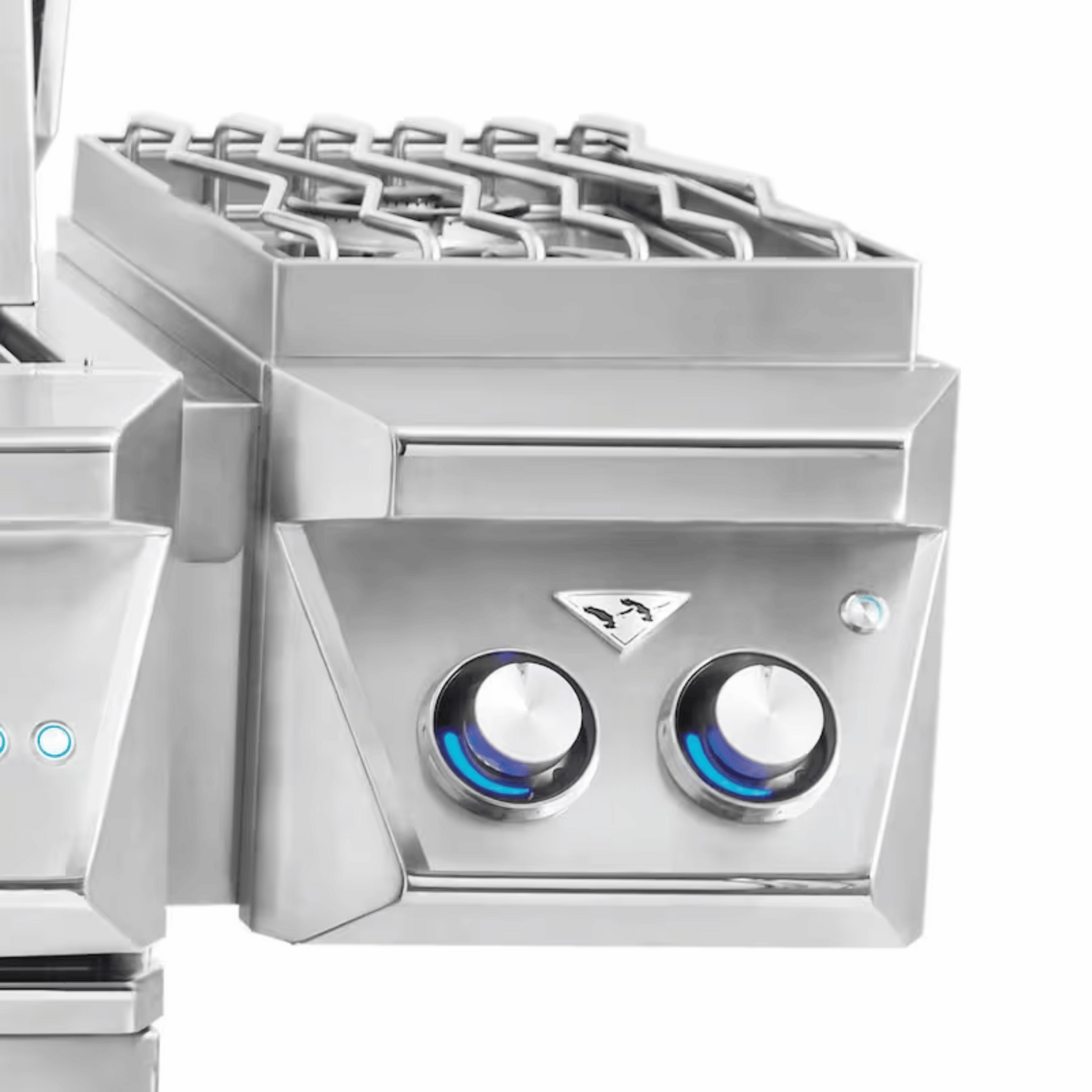 Experience exceptional cooking performance with Twin Eagles' USA-made cooking appliances. Crafted from high-quality 304 stainless steel, these durable and well-constructed appliances are built to last. Prepare multiple dishes simultaneously with the two powerful 17,000 BTU sealed dual ring burners. The recessed top ensures protection from the wind and easy cleaning. Enjoy the stylish Indigo Blue Exclusive Control Illumination that perfectly matches Twin Eagles grills. Designed for use with all Twin Eagles 30, 36, 42, and 54-inch grill carts, this cart-mounted side burner features seamless front panel construction with polished accents. The dual ring sealed burners provide efficient heat distribution, while the built-in wind guard adds extra protection. With the one-piece stainless steel S grate, you can effortlessly maneuver pots and pans on its smooth surface. The side burner also includes a matching stainless steel cover for added convenience. Elevate your outdoor cooking experience with Twin Eagles and embrace the pride of American craftsmanship.