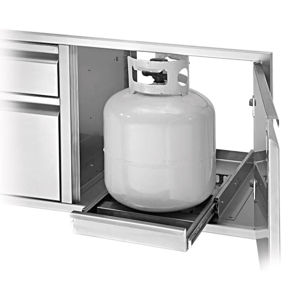 Enhance the functionality of your outdoor kitchen with the Twin Eagles TETS-KIT LP Tank Slide Kit. This premium product offers added versatility, allowing you to easily mount it inside any Twin Eagles door/drawer combo. Crafted from high-quality 304 stainless steel, it ensures durability and longevity. Say goodbye to storage hassles as it conveniently accommodates a standard 20 lb. propane tank. Elevate your grilling experience with Twin Eagles.