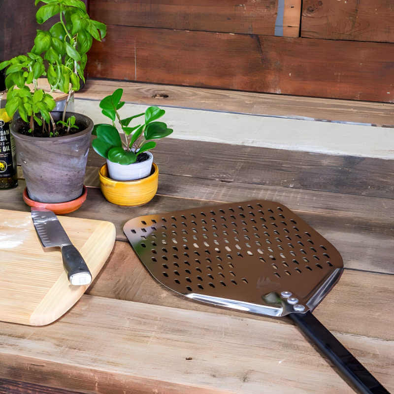 • 12-Inch Square Aluminum Peel: Offers the ideal surface area for handling and launching pizzas with precision.